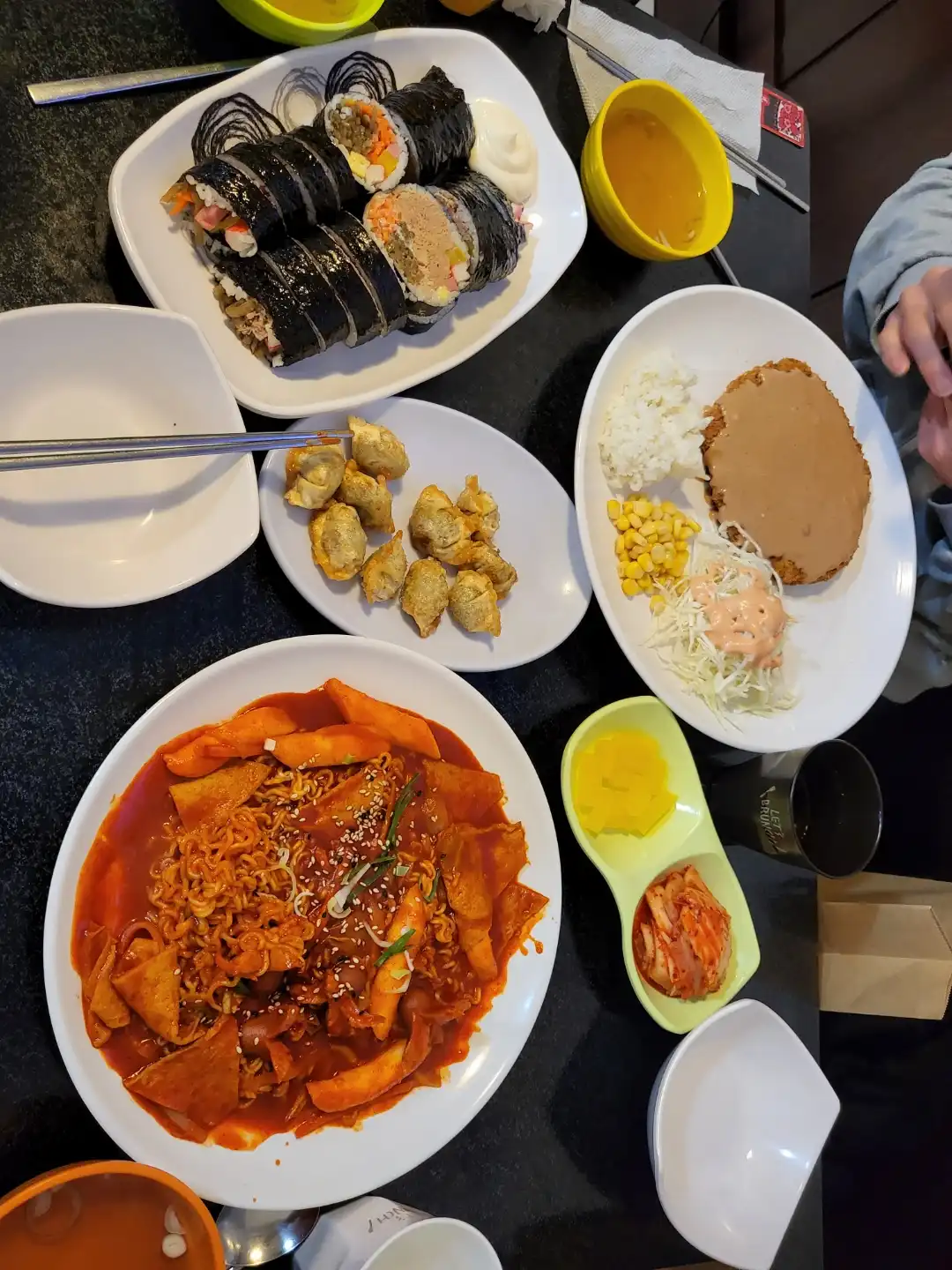 이공김밥(2,000원), 참치김밥(3,500원), 라볶이(4,000원), 등심 돈가스(5,500원), 물만두튀김(2,000원) 이렇게 주문했어요.