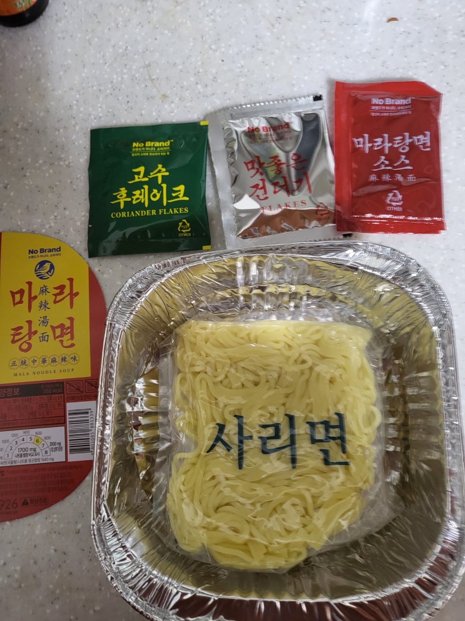 구성품은 사리면, 마라탕면 소스, 건더기, 고수 후레이크로 구성되어 있습니다.