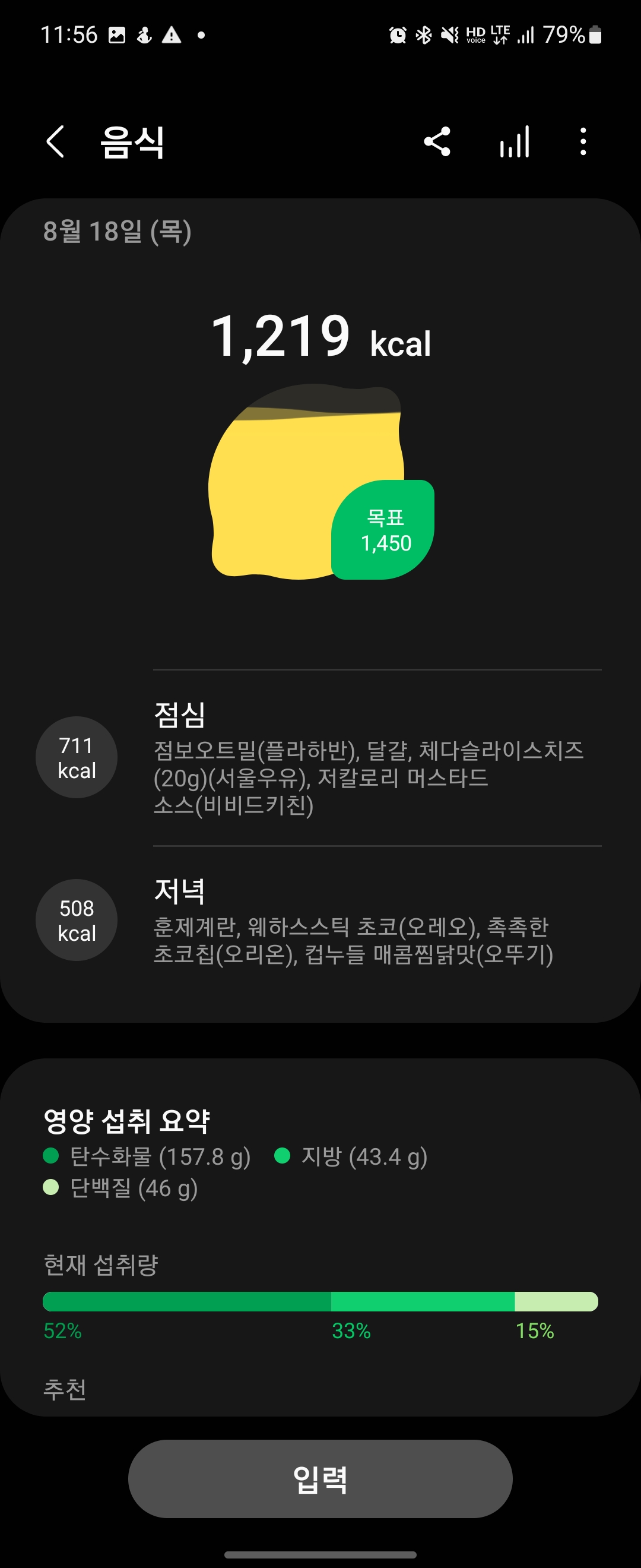총 섭취 칼로리 1,219kcal